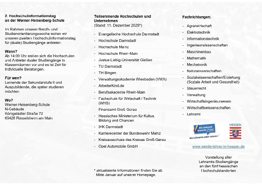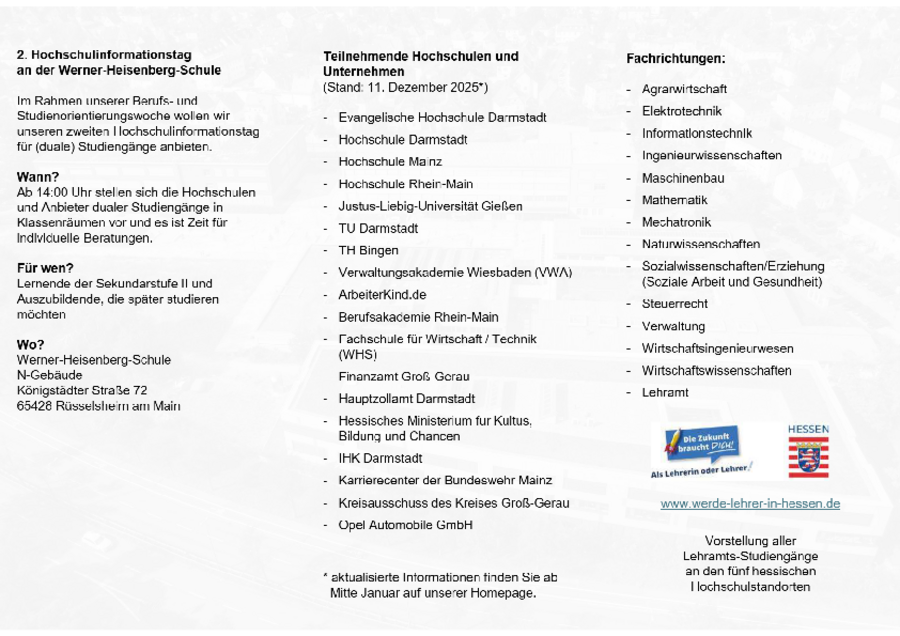 Im Rahmen unserer Berufs- und Studienorientierungswoche bieten wir unseren zweiten Hochschulinformationstag für (duale) Studiengänge an.