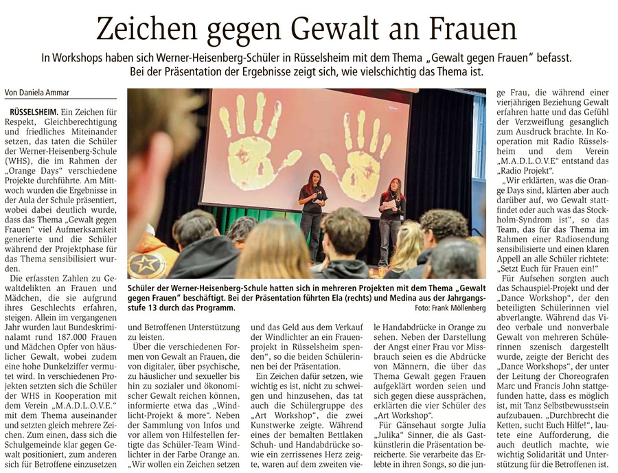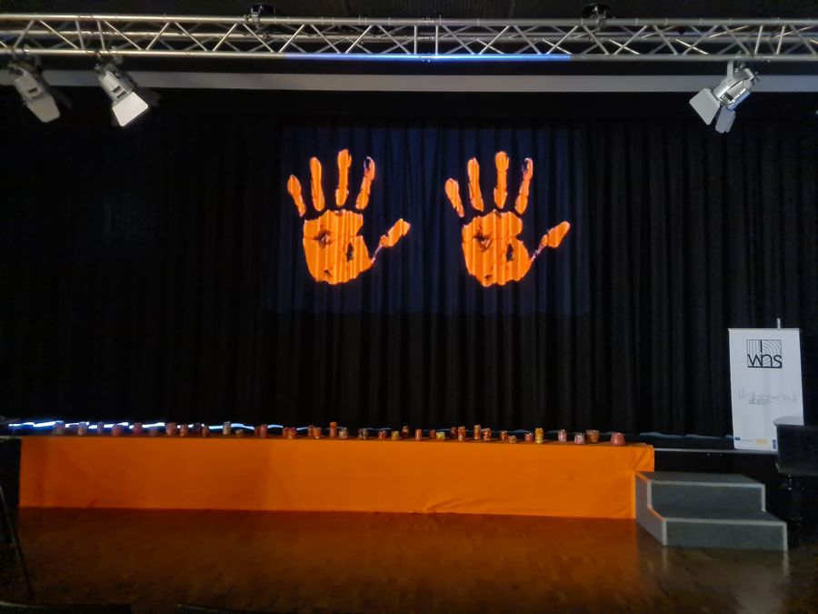 Die Klasse von Frau Graf-Frick hat sich mit den verschiedenen Formen von Gewalt thematisch auseinandergesetzt und zusätzlich Windlichter hergestellt, die im Anschluss der Veranstaltung verkauft wurden. Die hieraus erzielten Erlöse sollen an das Frauenhaus in Rüsselsheim gespendet werden. Außerdem hat die Klasse eine Informationspinnwand mit möglichen Hilfsangeboten ausführlich erarbeitet, die Betroffene in Situationen häuslicher Gewalt in Anspruch nehmen können.